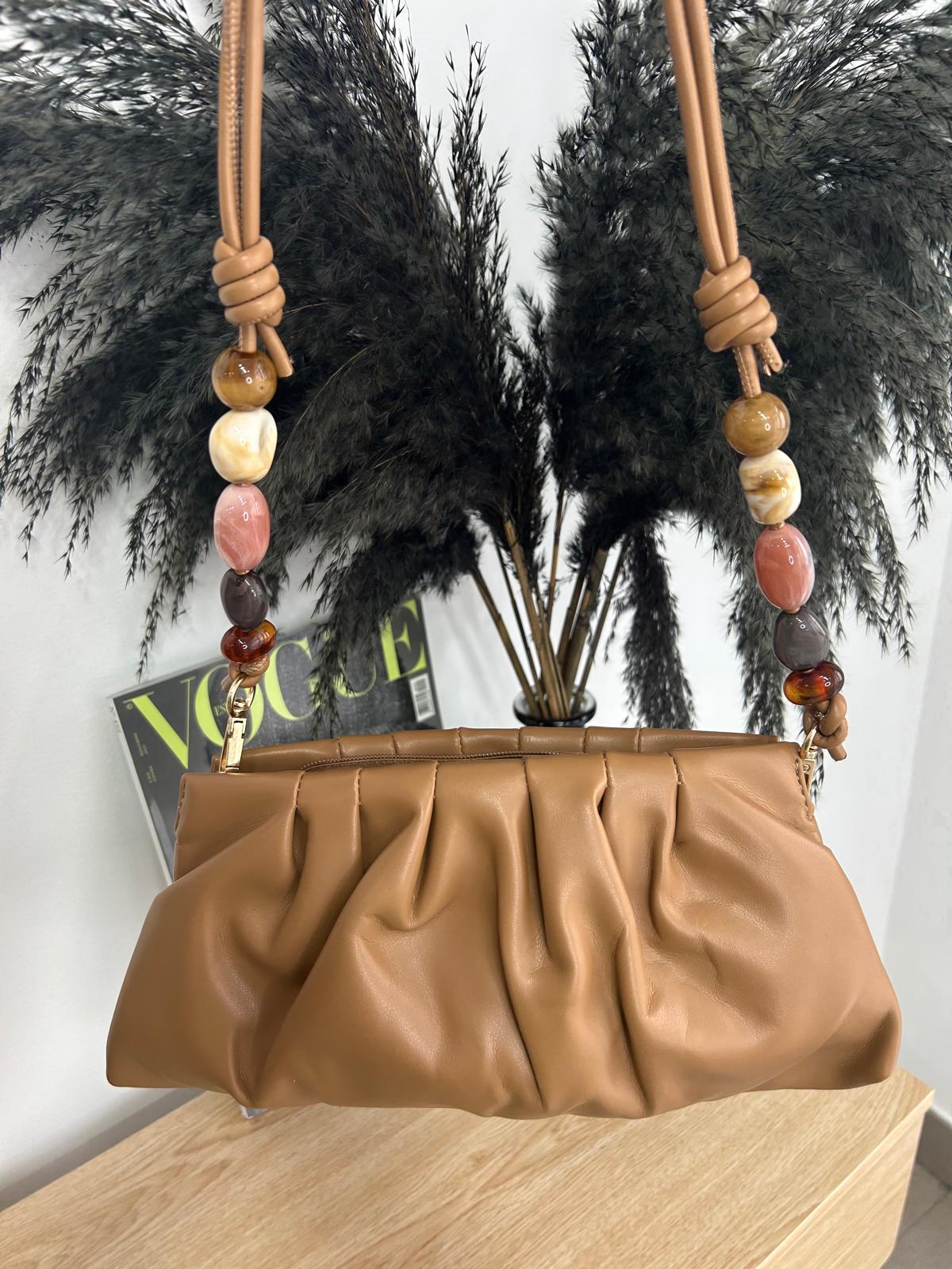 BOLSO DE MANO,CON ASA CON PIEDRAS DE COLORES.