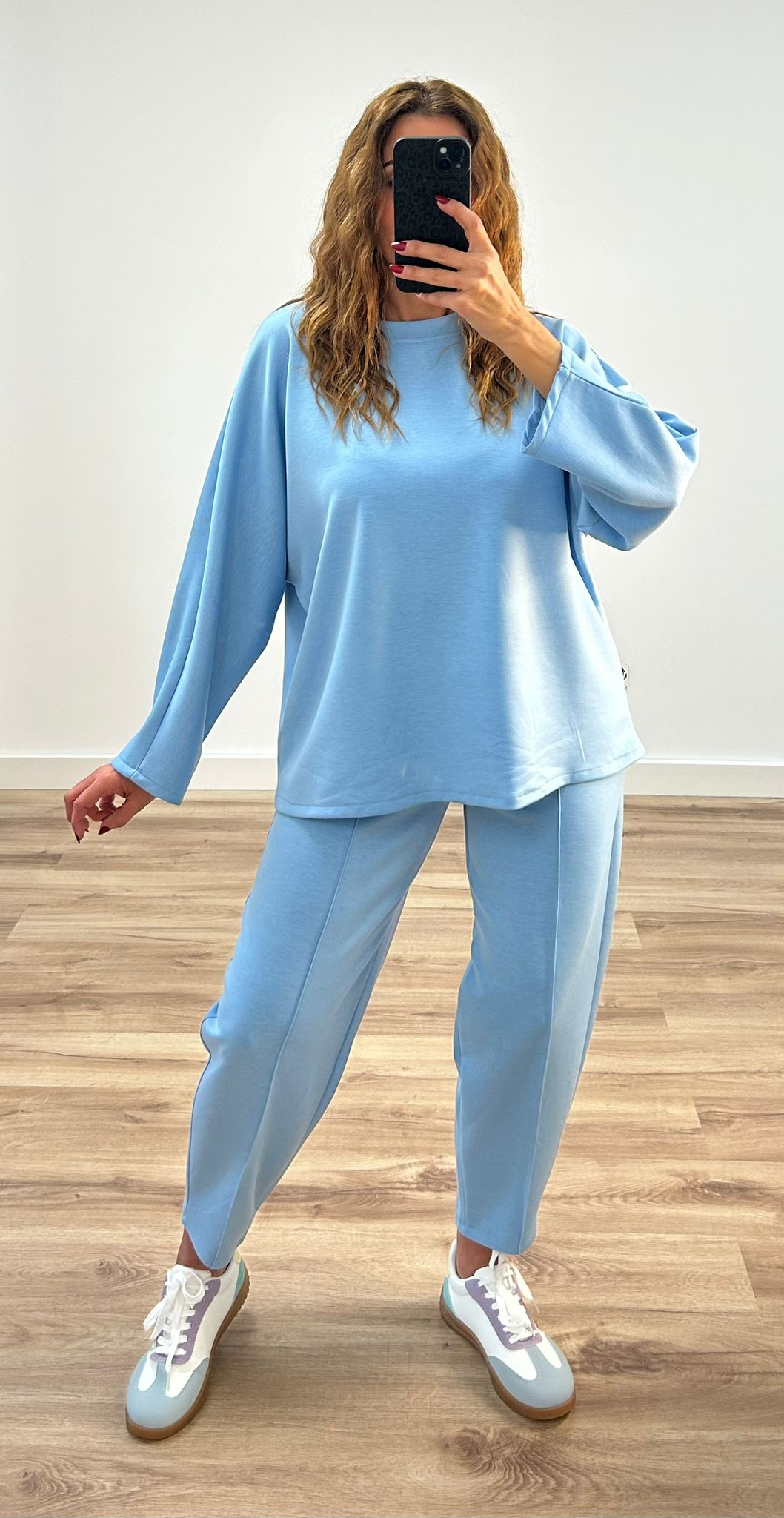 conjunto de dos piezas,parte de arriba oversize y pantalón con cinturilla elástica y cordones para ajustarlo.